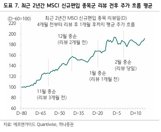 하나증권은 21일 5월 모건스탠리캐피털인터내셔널(MSCI) 지수 편입 가능성이 큰 이번 2월 편입에 실패할 것으로 판단되는 종목군에 대한 베팅이 의미가 있는 시점이라고 분석했다. 이와 함께 레인보우로보틱스, 현대오토에버, 한화 등을 5월 MSCI 편입 후보로 꼽았다.