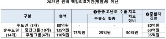 정부는 올해에도 2030억원을 투입해 권역책임의료기관을 강화한다. 기존에는 서울에 있는 병원 3개, 지역에 있는 병원 14개를 대상으로 지원했지만 올해에는 서울 1개, 지역 15개, 세종 1개로 구분해 총 17개를 대상으로 차등 지원할 예정이다.
