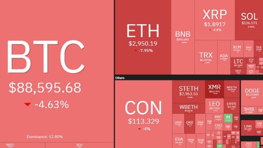 [디지털투데이 AI리포터] 암호화폐 시장이 전반적인 조정 국면에 진입했다. 21일 오전 7시 50분 코인360에 따르면, 비트코인(BTC)은 8만8595달러로 전일 대비 -4.63% 급락하며 9만달러선 아래로 밀려났다. 비트코인 시장 지배력은 52.80%로 여전히 높지만 매도 압력이 확대되고 있다.