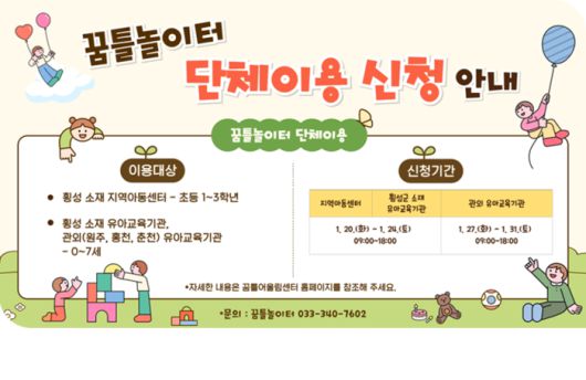 [스포츠서울ㅣ김기원기자]횡성군 꿈틀어울림센터 내 ‘꿈틀놀이터’가 아이들의 건강한 놀이 문화 확산을 위해 2026년도 상반기 단체 이용 신청을 받는다.