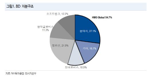 하늘 연구원은 “현대차는 BD 지분 54.7%를 보유한 HMG Global의 지분 49.5%를 보유해 결과적으로 BD 지분의 27.1%를 보유하고 있다”며 “BD 영업가치 53조3000억원의 27.1%인 14조4000억원이 재평가 받으며 최근 주가 상승을 견인하고 있다”고 분석했다.