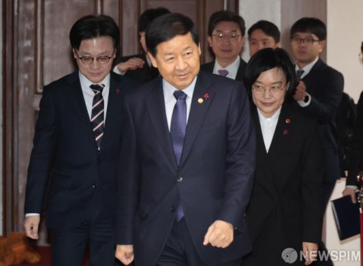 [서울=뉴스핌] 이길동 기자 = 구윤철 부총리 겸 재정경제부 장관이 21일 서울 종로구 정부서울청사에서 열린 경제관계장관회의에 김정관 산업통상부 장관(오른쪽), 한성숙 중소벤처기업부 장관과 함께 참석 하고 있다.  2026.01.21 gdlee@newspim.com