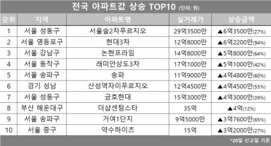 이 밖에도 경기 성남시 ‘산성역자이푸르지오’, 서울 성동구 ‘금호현대’, 부산 해운대구 ‘더샵센텀스타’, 서울 송파구 ‘거여1단지’, 중구 ‘약수하이츠’ 등이 전국 아파트값 상승 상위 10위권에 포함됐다.