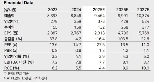 다만 올해는 실적 반등이 기대된다는 판단이다. LS증권은 HL만도의 올해 영업이익을 4290억 원으로 지난해 대비 15.0% 늘고, 영업이익률은 4.3%로 개선될 것으로 내다봤다. 북미 전기차 수요 부진에도 불구하고 현대차그룹 HMGMA 가동률 확대와 IDB 2세대 기반 믹스 개선이 이를 상쇄할 것이라는 설명이다.