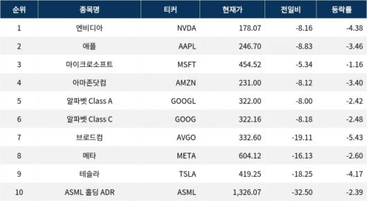 엔비디아(NVDA)는 178.07달러로, 전일 대비 4.38% 하락하며 가장 큰 하락폭을 기록했다. 애플(AAPL)은 246.70달러로 3.46% 하락했다. 마이크로소프트(MSFT)는 454.52달러로 1.16% 하락하여 상대적으로 적은 하락폭을 보였다.