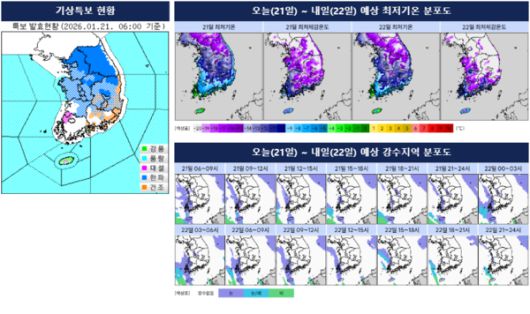 오늘과 내일(22일) 전국은 대체로 맑겠으나, 충남권·전라권·제주도는 대체로 흐릴 전망이다. 전라서해안과 전북남부내륙, 광주·전남중부내륙, 제주도 등에는 오늘 하루 동안 3cm~8cm, 많은 곳은 10cm 이상(제주도산지 25cm 이상)의 대설이 내릴 수 있다. 울릉도와 독도에도 10cm~30cm의 눈과 동일한 강수량이 예보됐다. 내일(22일) 예상 아침 최저기온은 -19도~ -5도, 낮 최고기온은 -7도~2도로 평년(-11도~0도, 1도~8도)보다 낮고, 모레(23일)도 전국에 -17도~ -1도의 강추위가 이어질 전망이다.