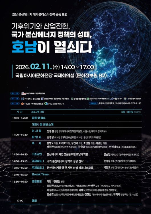 이번 포럼은 미래에너지정책연구원이 주최하고, 대혁신호남포럼, 대한전기학회, 한국환경경제학회, 전남대학교 지역개발연구소, 혁신과가치, 전남풍력산업협회가 공동 주관한다. 학계, 산업계, 정책 전문가들이 한자리에 모여 분산에너지 정책의 성패와 지역의 역할을 심도 있게 논의할 예정이다.