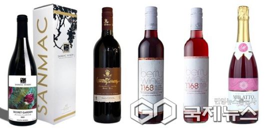 왼쪽부터 비원, 컨츄리 캠벨 드라이, 베리와인 1168CS, 1168RS10, 미르아토 로제 스파클링.(제공=영동군청) |