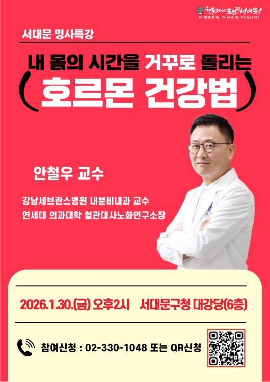 붉은색 배경의 포스터에 안경을 쓰고 흰 가운을 입은 안철우 교수가 미소를 짓고 있는 사진이다. 제목: 서대문 명사특강, 내용: 내 몸의 시간을 거꾸로 돌리는 호르몬 건강법, 강사는 안철우 교수, 강남세브란스병원 내분비내과 교수, 연세대 의과대학 혈관대사노화연구소장이다. |