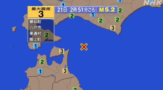 [서울=뉴스핌] 오영상 기자 = 21일 오전 2시 51분경, 일본 홋카이도와 아오모리현 일대에서 규모 5.2, 최대 진도 3의 지진이 발생했다.