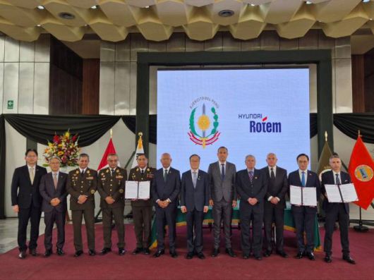 페루 리마에서 열린 K2 전차 및 K808 차륜형장갑차 공급 총괄합의 체결식에서 참석자들이 기념촬영을 하고 있다. 오른쪽부터 호르헤 자파타 페루 조병창 대표, 이용배 현대로템 사장, 에르네스토 알바레스 페루 국무총리, 페르난도 로스피글리오시 페루 국회의장, 호세 헤리 페루 대통령, 이용철 방위사업청장, 세사르 디아스 페루 국방부장관, 세사르 브리세뇨 페루 육군 총사령관, 오스왈도 까예 따예도 페루 육군 총참모총장, 호르헤 아레발로 페루 육군 군수사령관, 최종욱 주페루 대한민국 대사, 김태곤 방위사업청 국제협력관. [사진=현대로템] |