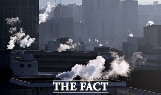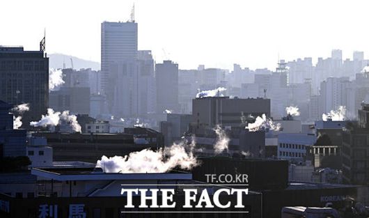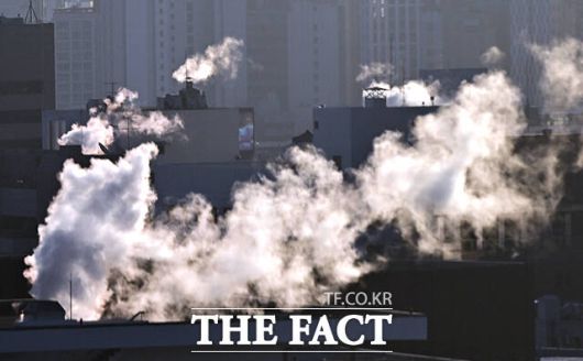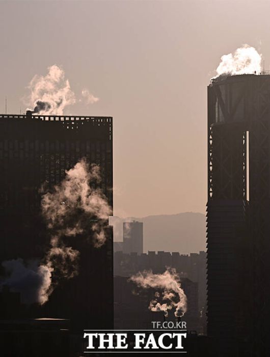 [더팩트ㅣ임영무 기자] 아침 기온이 영하 13도까지 떨어지며 전국 대부분 지역에 한파특보가 발효된 21일 오전 서울 광화문 인근 빌딩에서 난방열 수증기가 피어오르고 있다.