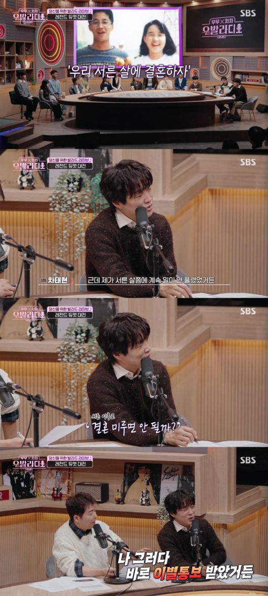 사연을 들은 차태현은 자신의 이별 경험도 고백했다. 그는 “내가 옛날에 서른 살에 결혼을 하려고 약속을 했다. 근데 서른 살쯤에 일이 계속 안 풀리더라”고 했고, 전현무는 “안 풀린 적이 있었냐”고 물었다.