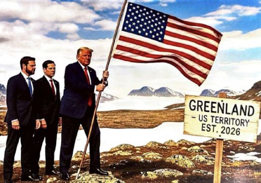사진 속 트럼프 대통령 옆에는 마코 루비오 국무부 장관과 J.D. 밴스 부통령이 함께 서 있으며 배경에 세워진 표지판에는 '그린란드-미국령 EST. 2026'이라는 문구가 적혀 있다.