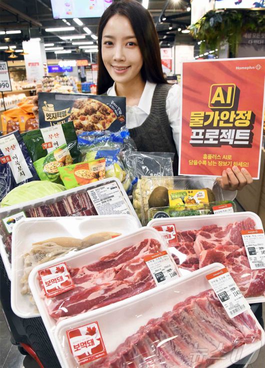 (서울=뉴스1) = 홈플러스가 고객 구매 데이터 분석을 통해 장바구니 핵심 품목을 최적가에 내놓는 ‘AI 물가안정 프로젝트’를 지속 전개하며 물가 안정 노력을 이어간다고 21일 밝혔다. 사진은 모델이 홈플러스 메가 푸드 마켓 라이브 강서점에서 ‘AI 물가안정 프로젝트’ 행사를 소개하는 모습. (홈플러스 제공. 재판매 및 DB 금지) 2026.1.21/뉴스1