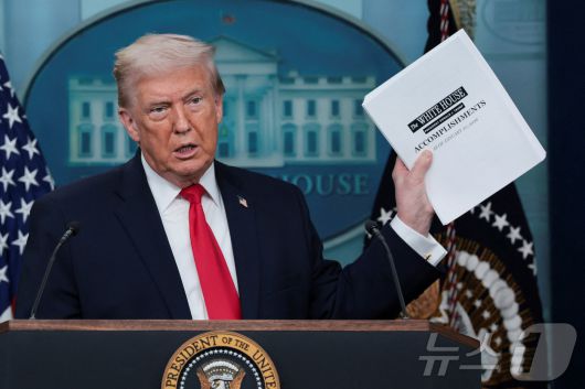 (워싱턴DC 로이터=뉴스1) 류정민 특파원 = 도널드 트럼프 미국 대통령이 두 번째 임기 1주년을 맞은 20일(현지시간) 워싱턴DC 백악관에서 자신의 성과를 모은 문서를 들어 보이고 있다. 2026.01.20. ⓒ 로이터=뉴스1 Copyright ⓒ 뉴스1. All rights reserved. 무단 전재 및 재배포, AI학습 이용 금지.