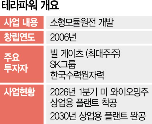 빌 게이츠가 2006년 설립한 테라파워는 GW(기가와트)급 에너지저장시스템(ESS)을 결합한 차세대 나트륨 원자로 기술을 보유한 기업이다. 현재 미국 와이오밍주에 세계 최초의 상업용 SMR 플랜트를 짓고 있으며 2030년 완공할 예정이다. SK그룹은 SK이노베이션과 SK㈜가 2022년 8월 테라파워에 투자해 2대 주주에 올랐다. 김무환 SK이노베이션 에너지솔루션사업단장은 “한수원의 테라파워 투자 합류로 3사 간 글로벌 SMR 사업 협력이 구체화됐다”며 “SK이노베이션은 앞으로 한수원과 함께 와이오밍 프로젝트 지원은 물론 해외 SMR 사업 진출, 소재·부품 국산화 등에서 혁신적인 성과 창출에 최선을 다할 것”이라고 했다.