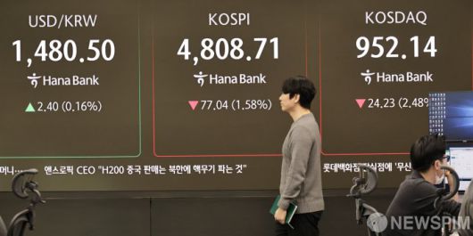 [서울=뉴스핌] 양윤모 기자 = 21일 오전 코스피가 전장 종가보다 77.04 포인트(1.58%) 하락하며 4808.71로, 코스닥은 24.23 포인트(2.48%) 하락한 952.14로 장을 시작한 가운데, 서울 중구 하나은행본점 딜링룸에서 직원들이 업무를 보고 있다. 서울외환시장에서 달러/원 환율은 전장 대비 2.40원 상승한 1480.50원에 주간거래를 시작했다. 2026.01.21 yym58@newspim.com