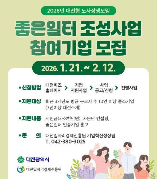 [헤럴드경제= 이권형기자] 대전시는 21일부터 오는 2월 12일까지 대전형 노사상생 모델‘2026년 좋은 일터 조성사업’에 참여할 12개 기업을 공개 모집한다.