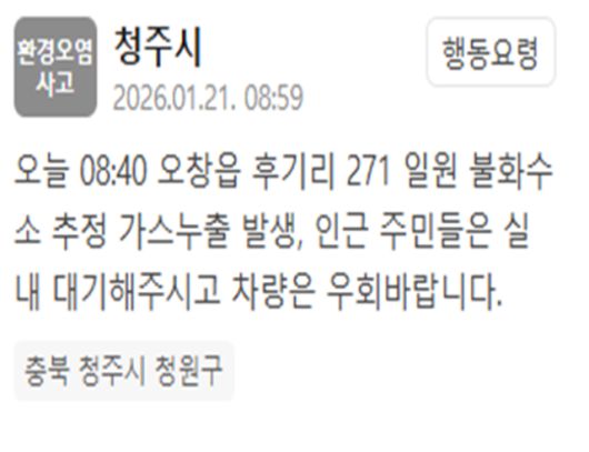 청주시는 21일 "오늘 오전 8시 40분께 오창읍 후기리 271 일원 불화수소 추정 가스 누출이 발생했다"는 내용이 담긴 재난문자를 발송했다.