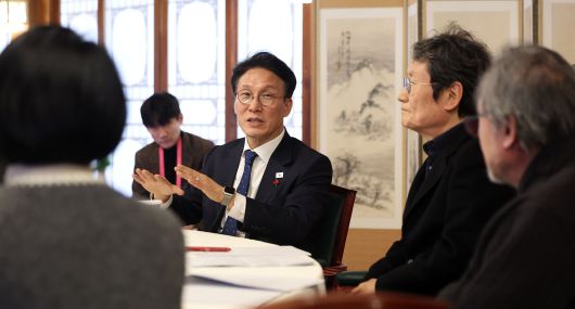 김민석 국무총리가 20일 서울 종로구 삼청동 총리공관에서 배우 문성근 및 연극인들과 간담회를 하고 있다. / 뉴스1 |