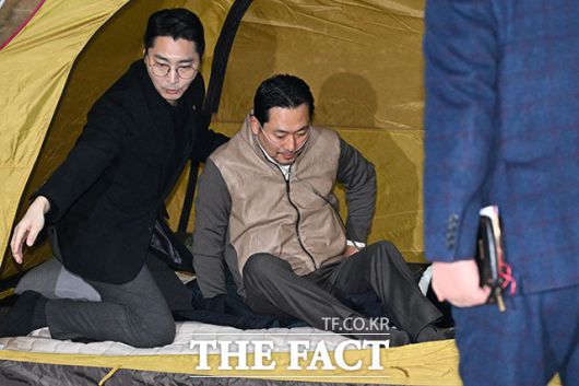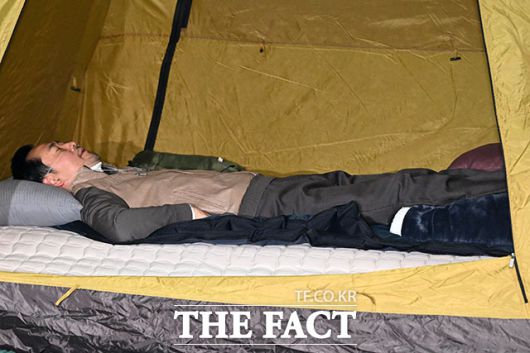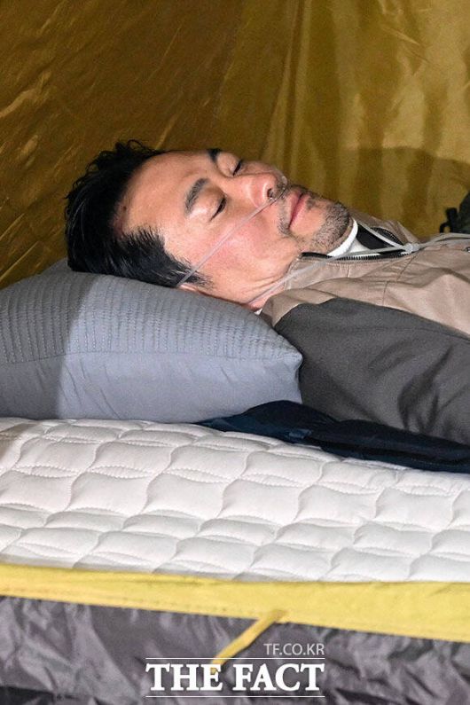 [더팩트ㅣ국회=남용희 기자] 통일교와 공천헌금 쌍특검 수용을 요구하며 이레째 단식을 이어가고 있는 장동혁 국민의힘 대표가 21일 오전 서울 여의도 국회 로텐더홀 농성장에서 의료용 산소 발생기를 착용한 채 누워있다.