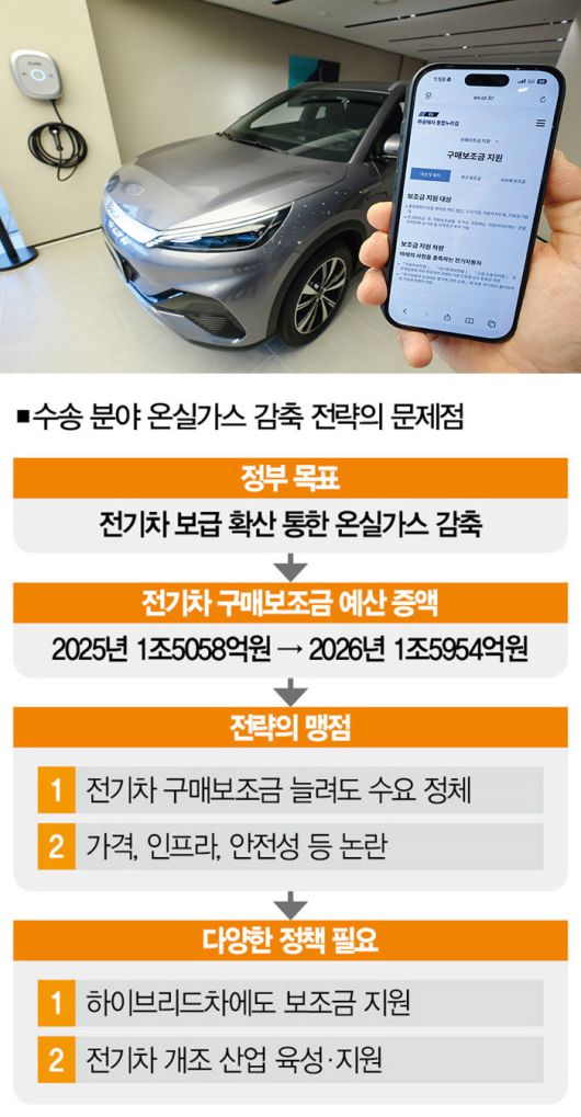 여기서 짚어보고 싶은 건 수송 분야에서의 온실가스 배출량 감축 전략이다. 전기차 보급을 확대하겠다는 이재명 정부의 방침은 분명 바람직하다. 윤석열 정부에서 확 줄였던 전기차 구매보조금 지원 예산도 늘렸다. 지원 예산은 2023년 1조9180억원에서 2025년 1조5058억원까지 줄었는데, 2026년에는 이보다 6.0% 늘어난 1조5954억원을 책정했다. 시장에 가성비 좋은 신형 전기차가 많아진 만큼 선택의 폭도 넓어졌다.
