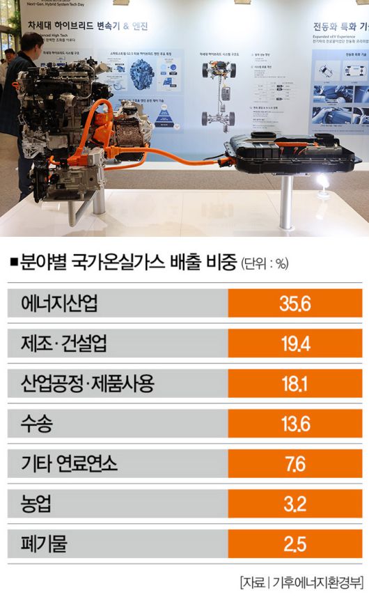 그렇다면 목표 달성을 위해 정부가 해야 할 일은 뭘까. 분야별 국가온실가스 배출 비중을 보면 자연스럽게 답이 나온다. 기후에너지환경부에 따르면, 2022년 기준 국가온실가스 배출 비중은 에너지산업이 35.6%로 가장 높았다. 그 외 제조ㆍ건설업이 19.4%, 산업공정ㆍ제품사용이 18.1%, 수송이 13.6%였다. 나머지는 기타 연료연소(7.6%), 농업(3.2%), 폐기물(2.5%) 등에서 배출됐다.