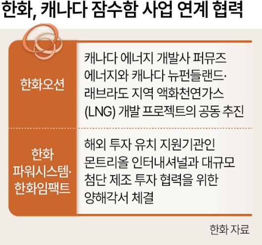 ▶한화, 캐나다서 ‘LNG 개발 프로젝트’ 추진=21일 업계에 따르면 한화오션은 최근 캐나다 에너지 개발사 퍼뮤즈 에너지와 캐나다 뉴펀들랜드·래브라도 지역의 액화천연가스(LNG) 개발 프로젝트의 공동 추진을 위한 전략적 양해각서(MOU)를 체결했다. 이번 협력은 한화오션이 참여 중인 캐나다 잠수함 사업 및 캐나다의 북극·다해역 전략과 연계된 장기 산업협력의 일환이라는 게 회사 측의 설명이다.