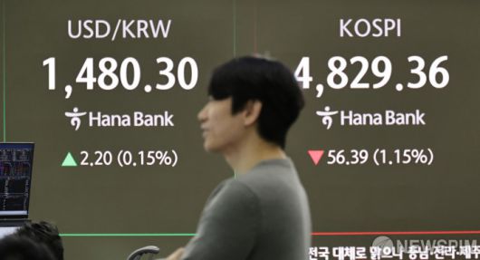 [서울=뉴스핌] 양윤모 기자 = 21일 오전 코스피가 전장 종가보다 56.39 포인트(1.15%) 하락하며 4829.36으로, 코스닥은 24.99 포인트(2.56%) 하락한 951.38로 장을 시작한 가운데, 서울 중구 하나은행본점 딜링룸에서 직원들이 업무를 보고 있다. 서울외환시장에서 달러/원 환율은 전장 대비 2.20원 상승한 1480.30원에 주간거래를 시작했다. 2026.01.21 yym58@newspim.com