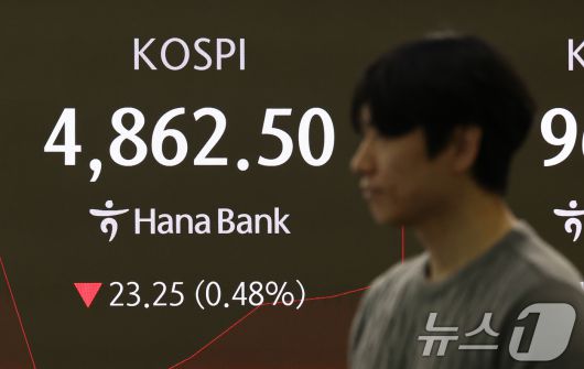 (서울=뉴스1) 최지환 기자 = 그린란드 사태 충격으로 미국 증시가 일제히 급락한 21일 오전 서울 중구 하나은행 본점 딜링룸 전광판에 코스피 지수가 전 거래일 대비 23.25p(0.48%) 하락한 4,862.50을 기록하고 있다. 2026.1.21/뉴스1