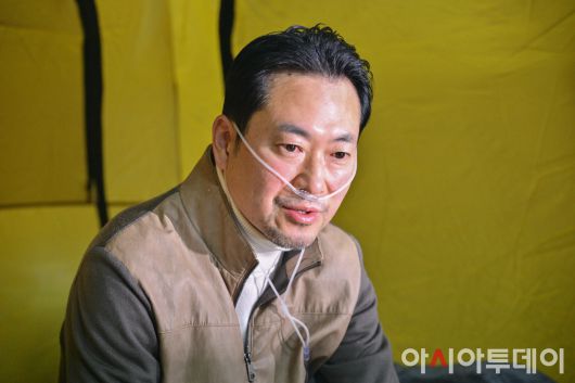 아시아투데이 송의주 기자 = 장동혁 국민의힘 대표가 21일 국회 로텐더홀에 마련된 단식 농성장에서 의료용 산소 발생기를 착용한 채 이준석 개혁신당 대표와 대화하고 있다. ⓒ "젊은 파워, 모바일 넘버원 아시아투데이"