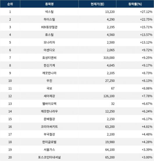 이밖에도 국보(001140) ▲8.06%, 세아제강(306200) ▲7.78%, 웰바이오텍(010600) ▲6.67%, 깨끗한나라우(004545) ▲6.24%, 문배철강(008420) ▲6.17%, 코리아써키트(007810) ▲4.81%, 부국철강(026940) ▲4.48%, 한미글로벌(053690) ▲4.28%, 서울가스(017390) ▲3.39%, 포스코인터내셔널(047050) ▲3.00% 등을 기록하며 시장에서 활발히 거래되고 있다.