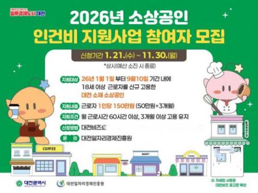 박제화 대전시 경제국장은 "소상공인을 둘러싼 경영 여건이 지속적으로 어려워지고 있는 상황에서 이번 인건비 지원이 현장에 도움이 되기를 기대한다"며 "앞으로도 소상공인의 의견을 정책에 반영해 체감도 높은 지원이 이루어질 수 있도록 노력하겠다"고 강조했다.