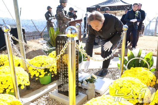 군 사망사고 분과위원장인 박찬운 교수가 김상현 이병 추모비에 헌화하고 있다. (국방부 제공. 재판매 및 DB 금지) /뉴스1 |