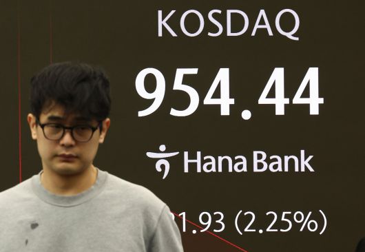 그린란드 사태 충격으로 미국 증시가 일제히 급락한 21일 오전 서울 중구 하나은행 본점 딜링룸 전광판에 코스닥 지수가 표시되어 있다. /뉴스1 |