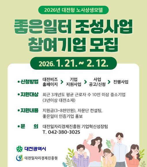 [대전=뉴스핌] 김수진 기자 = 대전시는 대전형 노사상생 모델 '2026년 좋은 일터 조성사업'에 참여할 12개 기업을 공개 모집한다.