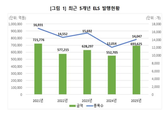 21일 한국예탁결제원에 따르면 2025년 ELS(ELB 포함) 총 발행금액은 69조3625억 원으로 집계됐다. 이는 전년(55조2705억 원) 대비 25.5% 늘어난 규모다. 같은 기간 상환금액은 61조4931억 원으로 전년 대비 13.4% 감소했다.