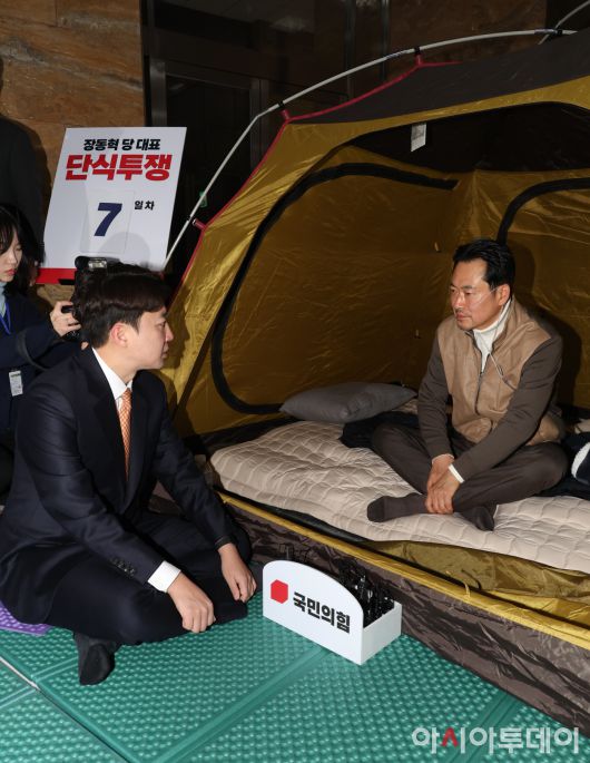 아시아투데이 송의주 기자 = 장동혁 국민의힘 대표가 21일 국회 로텐더홀에 마련된 단식 농성장에서 이준석 개혁신당 대표를 만나고 있다.