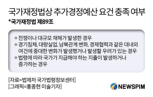 국가재정법 제89조에는 ▲전쟁이나 대규모 재해가 발생한 경우 ▲경기침체, 대량실업, 남북관계 변화, 경제협력과 같은 대내외 여건에 중대한 변화가 발생했거나 발생할 우려가 있는 경우 ▲법령에 따라 국가가 지급해야 하는 지출이 발생하거나 증가하는 경우 등을 추경 요건으로 명시했다.