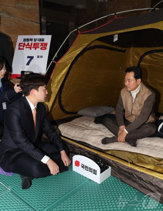 (서울=뉴스1) 신웅수 기자 = 이준석 개혁신당 대표가 21일 서울 여의도 국회 로텐더홀에서 단식투쟁 일주일째를 맞은 장동혁 국민의힘 대표의 농성장을 찾아 대화를 하고 있다. (공동취재) 2026.1.21/뉴스1