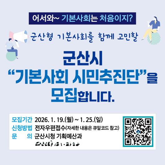 아시아투데이 박윤근 기자 = 전북 군산시가 오는 25일까지 '군산시 기본사회 시민추진단'을 공개 모집한다.