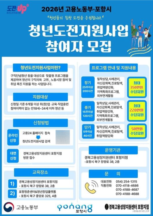 경북 포항시는 장기간 미취업 상태이거나 구직에 어려움을 겪는 청년들의 노동시장 복귀를 지원하기 위해 '2026 청년도전지원사업' 참여자 130명을 선착순 모집한다.