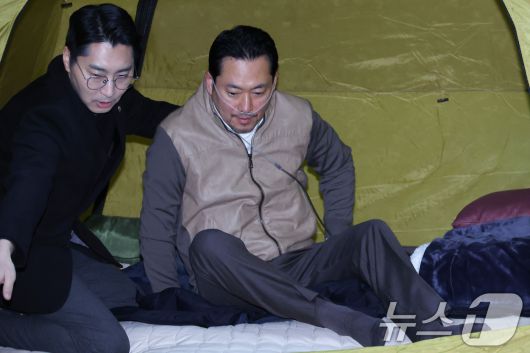 (서울=뉴스1) 신웅수 기자 = 단식 중인 장동혁 국민의힘 대표가 21일 서울 여의도 국회 로텐더홀에 마련된 단식 농성장에서 의료용 산소 발생기를 착용하고 있다. 2026.1.21/뉴스1