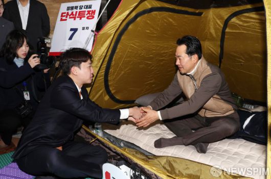 [서울=뉴스핌] 정일구 기자 = 통일교·공천헌금 '쌍특검' 수용을 촉구하며 단식 7일 차를 맞은 장동혁 국민의힘 대표가 21일 오전 서울 여의도 국회 로텐더홀 단식 농성장을 찾은 이준석 개혁신당 대표와 인사하고 있다. 2026.01.21 mironj19@newspim.com