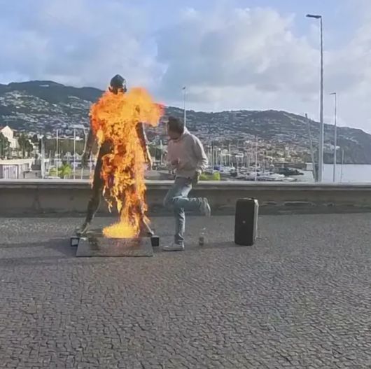 더 선은 21일(한국시간) "한 젊은 남성이 전 맨체스터 유나이티드, 레알 마드리드 공격수 호날두의 동상에 인화생 액체를 부은 뒤 라이터로 불을 붙였다"고 전했다.