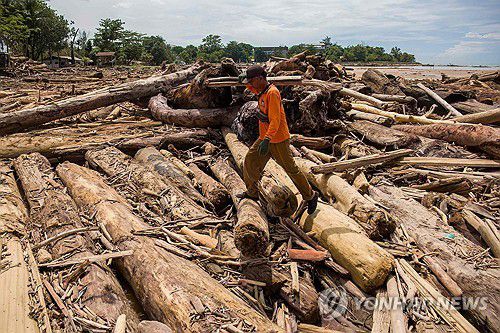 인도네시아 수마트라섬 홍수 이후 떠내려온 통나무들 |