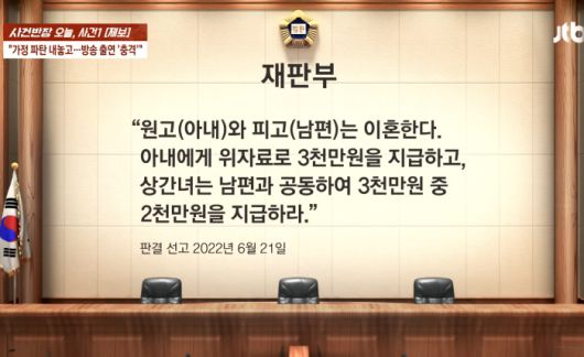 이에 대해 방송에 출연한 양지열 변호사는 "판결문에 따르면 해당 여성이 입사한 이후 부정한 관계로 발전했고, 해외여행 등 정황이 인정돼 혼인 파탄의 책임이 남편과 상대 여성에게 있다고 법원이 판단했다"며 "법원은 위자료 3000만 원을 남편과 상간녀가 연대해 지급하라고 판결했지만, 제보자는 현재까지 위자료를 받지 못했고 재산분할도 마무리되지 않았다"고 밝혔다.