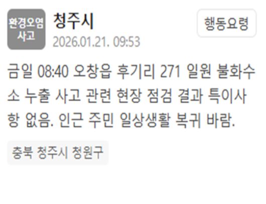 청주시는 21일 "금일 오전 8시 40분께 오창읍 후기리 271 일원 불화수소 누출 사고 관련 현장 점검 결과 특이사항이 없었다"는 내용이 담긴 재난문자를 발송했다.