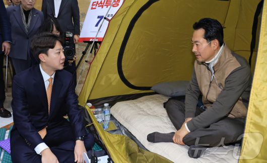 (서울=뉴스1) 신웅수 기자 = 통일교·공천헌금 '쌍특검' 수용을 요구하며 단식 7일 차를 맞은 국민의힘 장동혁 대표가 21일 서울 여의도 국회 로텐더홀 단식 농성장을 찾은 개혁신당 이준석 대표와 대화하고 있다. (공동취재) 2026.1.21/뉴스1urodoct2@news1.krCopyright ⓒ 뉴스1. All rights reserved. 무단 전재 및 재배포, AI학습 이용 금지.